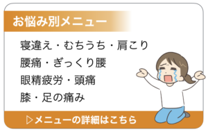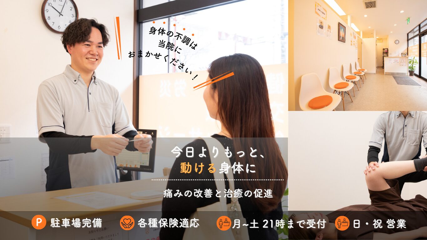 肩こり・腰痛・膝痛などの慢性的な症状から、交通事故によるむち打ち、スポーツによるケガ、産後の骨盤矯正、美容鍼まで幅広く対応しています。